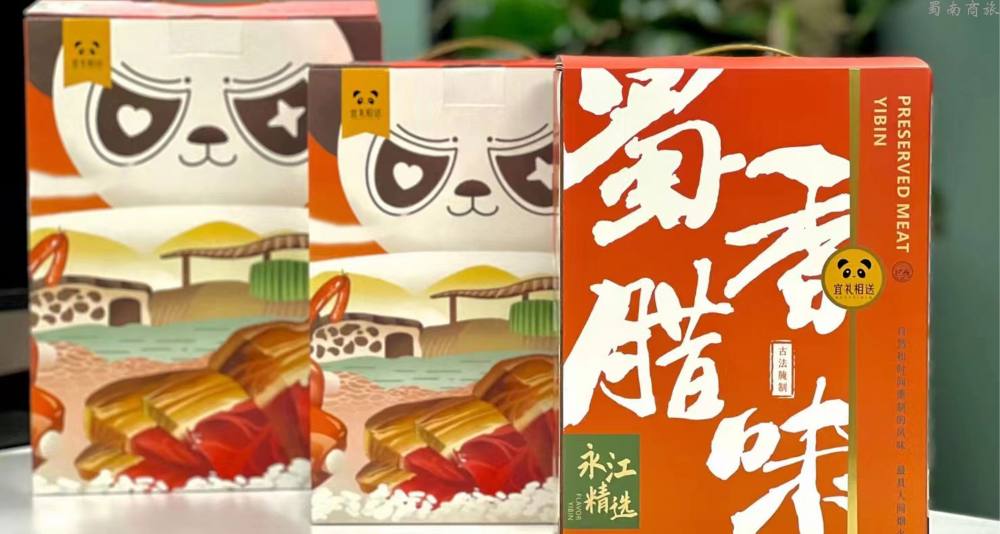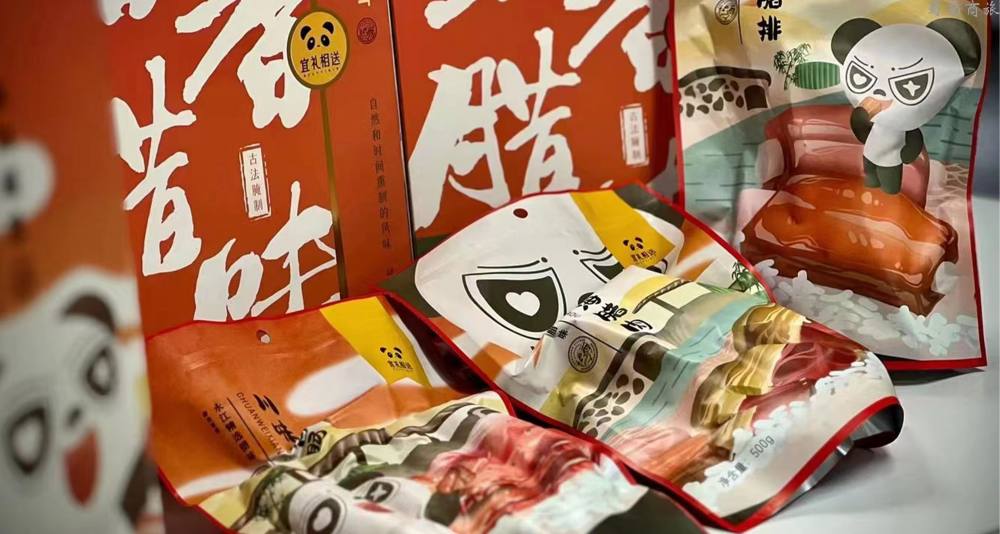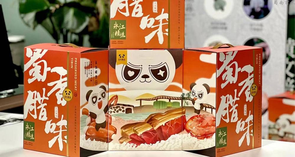 蜀香腊味选取了三大热门的蜀南腊味,希望用味道传递一份来 自宜宾的爱与心意。 有故事、有情感的外包装表达了蜀南竹海人的生活情趣。产品的外包装结合竹海IP形象竹小侠和永江 村的山水田园乡村风光。画面展现了一座外观形似竹荪的永江村乡村会客厅,村外三江环绕、竹林曲 径通幽,可爱的竹小侠正酣畅漓淋地品味着腊味美食。蜀香腊味的腊排骨、腊肉和香肠就是在这依山 傍水的地方,通过道道工序匠心熏制而成。这份美食就像“蜀南竹海”这本书的目录,将当地的风物 传奇娓娓道来。